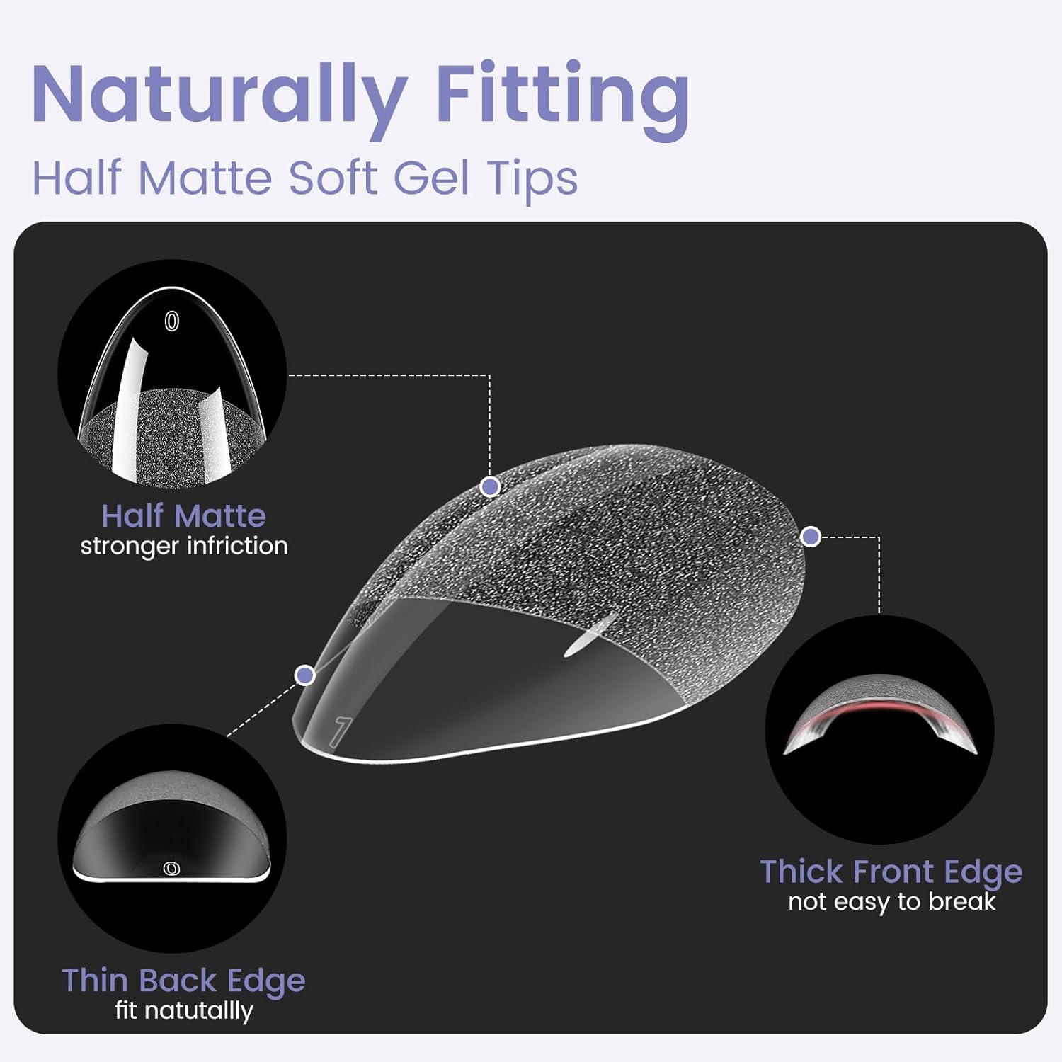- 0 Pressure Breathable Feeling - Wilfniee Medium almond shaped nail tips designd with β Thin back edge, thick front edgeβfor natural fit effect. The thinner back edge can make the soft nail tips fit your nails better, which will not make you feel uncomfortable. Also, the clear nail tips are more breathable, which will not cause burden and pressure on your fingers; The thickened front edge makes it not easy to break or bend for last long time use. Just like grows on you, prefect fitting