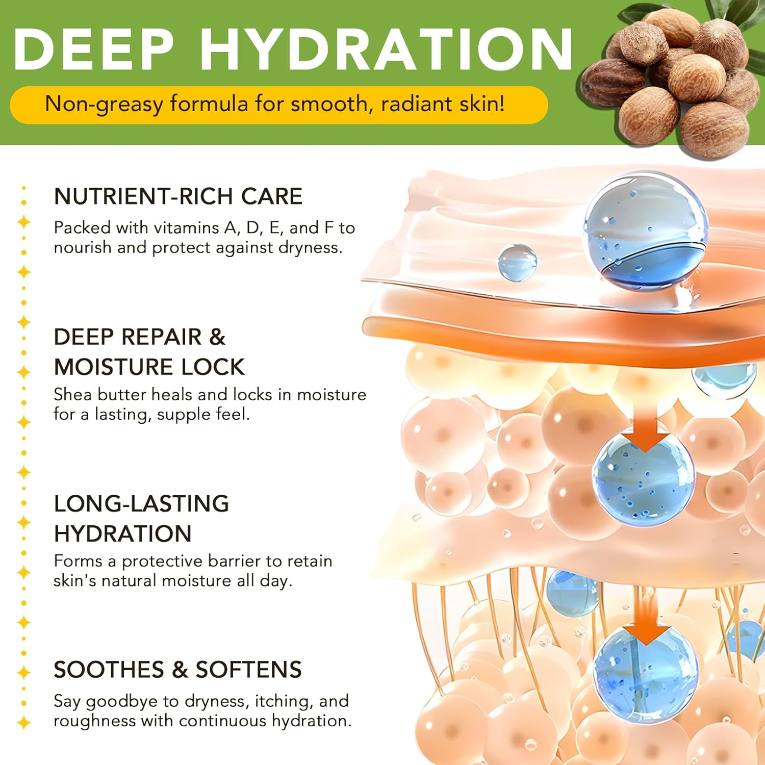 - Ultra Hydration : Shea butter lotion has super moisturizing abilities, locking in moisture, deeply hydrating and revitalizing, leaving skin soft and elastic.
