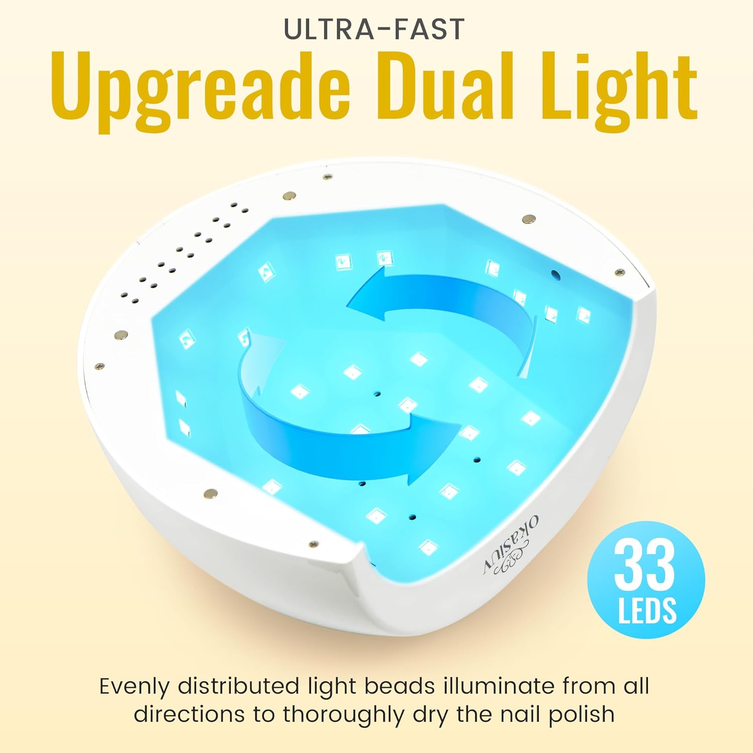 - 【Lightning-Fast Drying in 30-90 Seconds】Okasiuv nail lamp with 33 high-power LED bulbs (365nm + 405nm) cure all gel types—base, color, top coat, builder gel—flawlessly in just 30-90 seconds. No sticky layers, no uneven curing