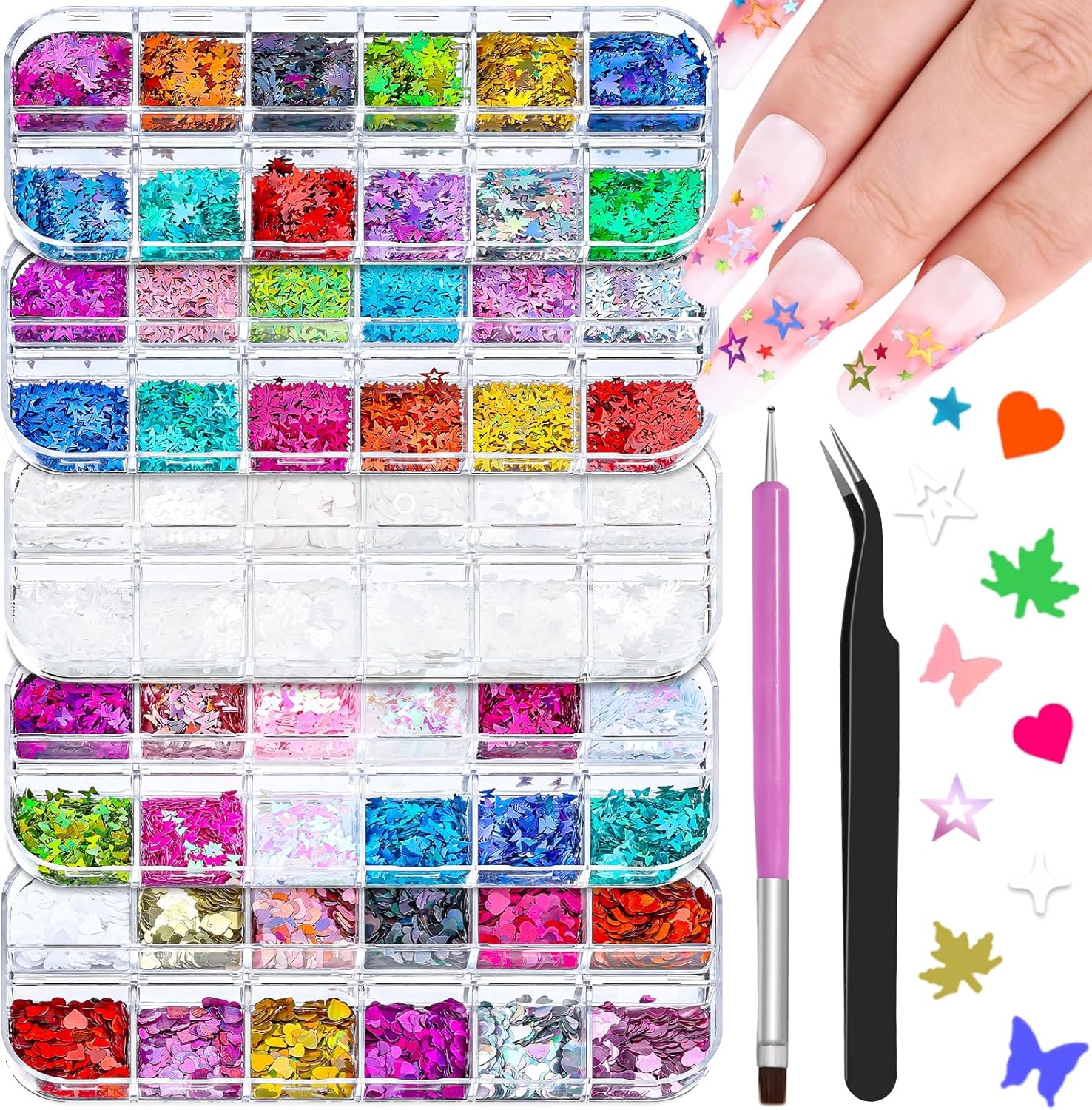 - Nail Sequins Decoration Kit: You'll get 5 boxes of mixed-shaped sequins (butterflies, hearts, stars, moons, flowers, diamonds, etc.), 1 pair of precision tweezers, and 1 cs of dual-end nail brush/dotting penโeverything you need for stunning nail art!
