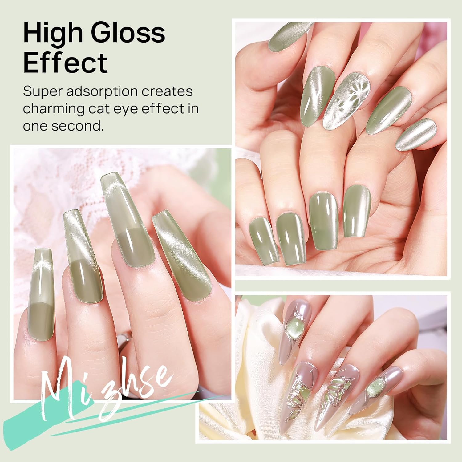 MIZHSE Quick Dry Cat Eye Nail Polish, Green Magnetic Nail Polish with Magnet, Air Drying Fast 15ml Cateye Nail Lacquer for Women Girls Non-Gel Nail Art Manicure DIY Home