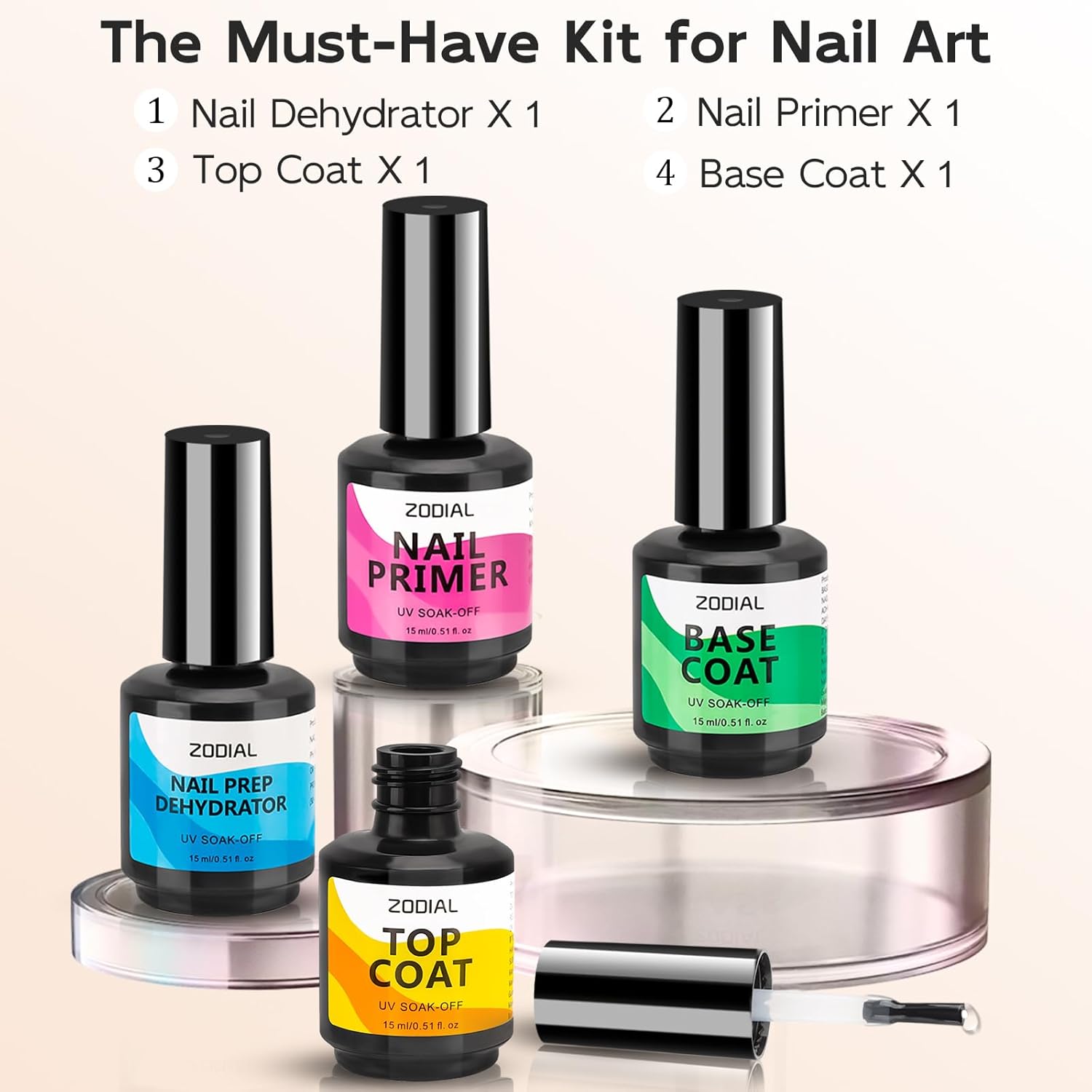 - ZODIAL Nail Dehydrator and Primer with No Wipe Top Coat & Base Coat: Use Nail Prep Dehydrator for optimal adhesion. Air Dry for 1 Second, remove the grease on the nail surface and clean the nails. Then use the Nail Primer, Air dry for 1 Second, enhances.Enjoy long-lasting wear for over 28 days with a perfect shine. The flexible Top Coat prevents nicks, chips, and smudges. Tip: The Base Coat is designed to remain sticky, providing a solid foundation for the next coat of polish