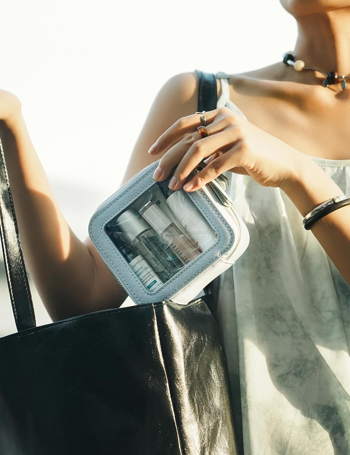 - [Premium Material and Durability] – The clear small cosmetic case, both the exterior and interior, is crafted from high-grade saffiano faux leather, which is highly scratch resistant, durable and exceptionally easy to keep clean. It features a smooth zipper for secure closure, and elegant light gold metal hardware accents, adding a luxurious and sophisticated touch to the bag's overall design.