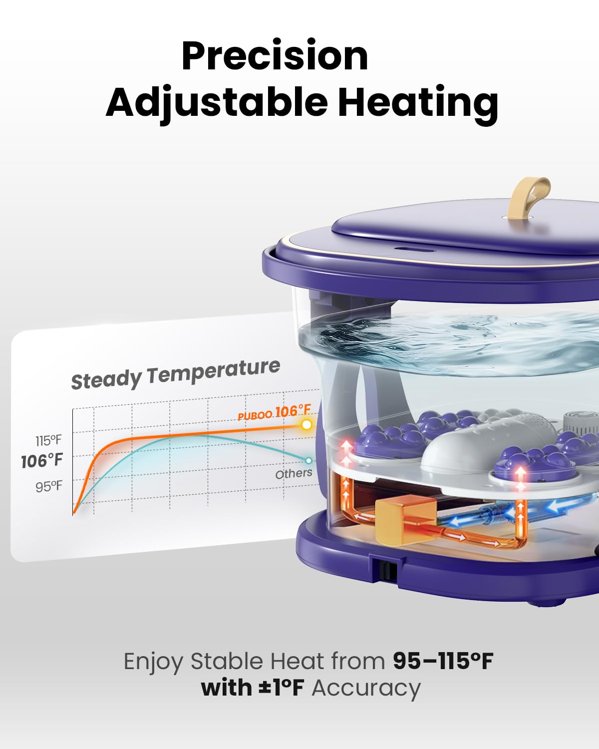 - Consistent and Adjustable Heating: Enjoy precise temperature control between 95°F–115°F with 1°F accuracy. The foot bath massager uses bottom water circulation heating to evenly warm the entire tub and automatically reheats as needed—no more refilling with hot water. Please note: the heating function cannot be turned off during use while the minimum temperature can only reach to 95℉, and the unit is not designed for cold water circulation. Ideal for users seeking consistent warmth throughout their foot soak.