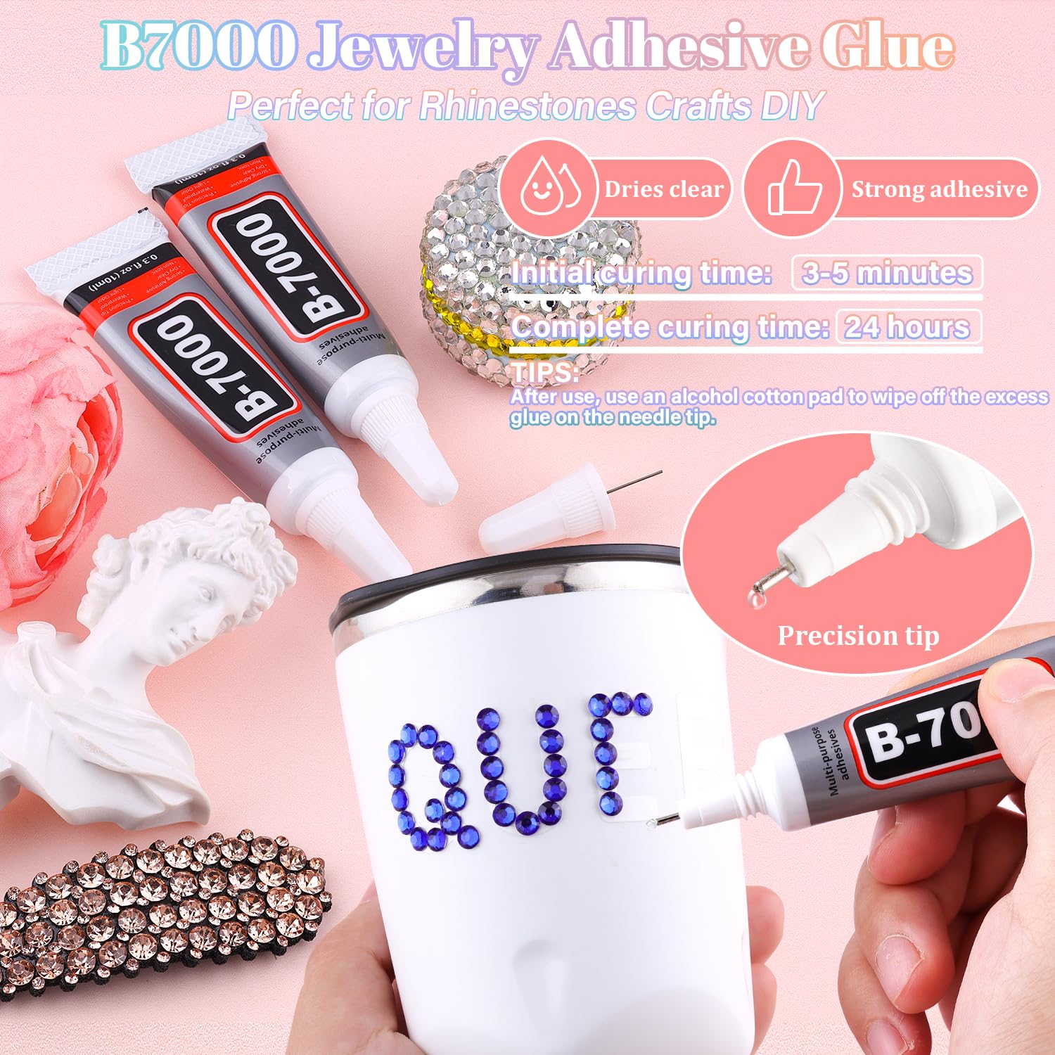 - STRONG B7000 GLUE FOR GEMS – B7000 glue offers strong, long-lasting adhesion and dries clear, making it perfect for securing gemstones and other embellishments. The precision needle tip allows for controlled, mess-free application. For best results, clean the needle with an alcohol wipe after each use to prevent clogging and ensure smooth flow every time.