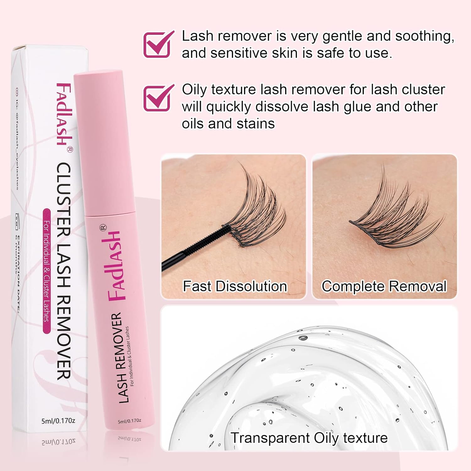 - Mild Formula: Cluster lash remover use safe formula, professionally tested many times, Our lash remover is very gentle and soothing, and sensitive skin is suitable to use.FADLASH lash remover for cluster lashes can be used on multiple types of lashes, so if you use clusters, false lashes, and strip lashes regularly and are looking for a good lash remover, look no further again! Click to take it homeοΌ