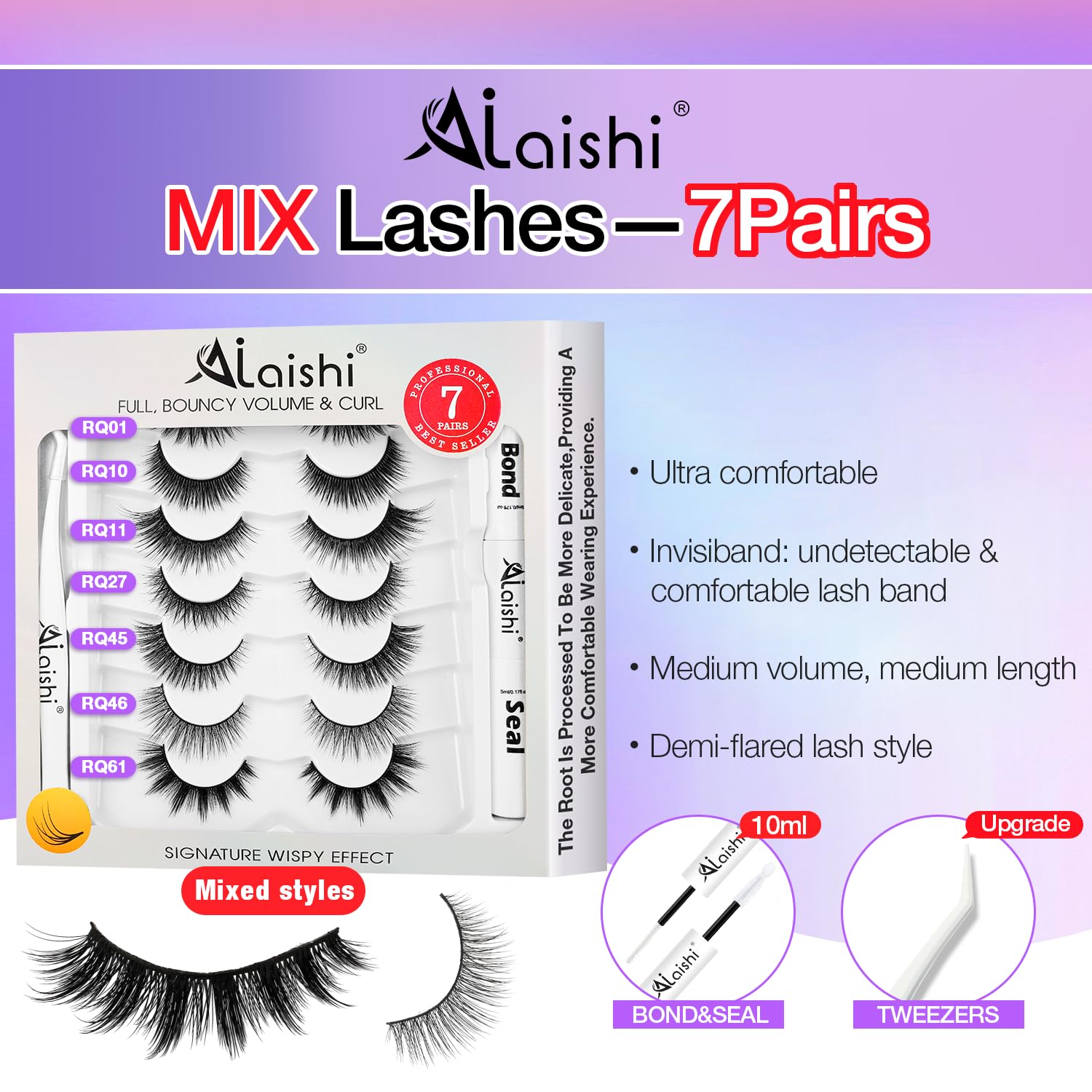 Wispy False Eyelashes Kit With Bond, Seal and Tweezer, 7 Pairs Natural Look Fake Cat Eye Lashes Strips Thin Band Extensions Waterproof Easy Eyelashes for Beginners RQ7Variety Mix