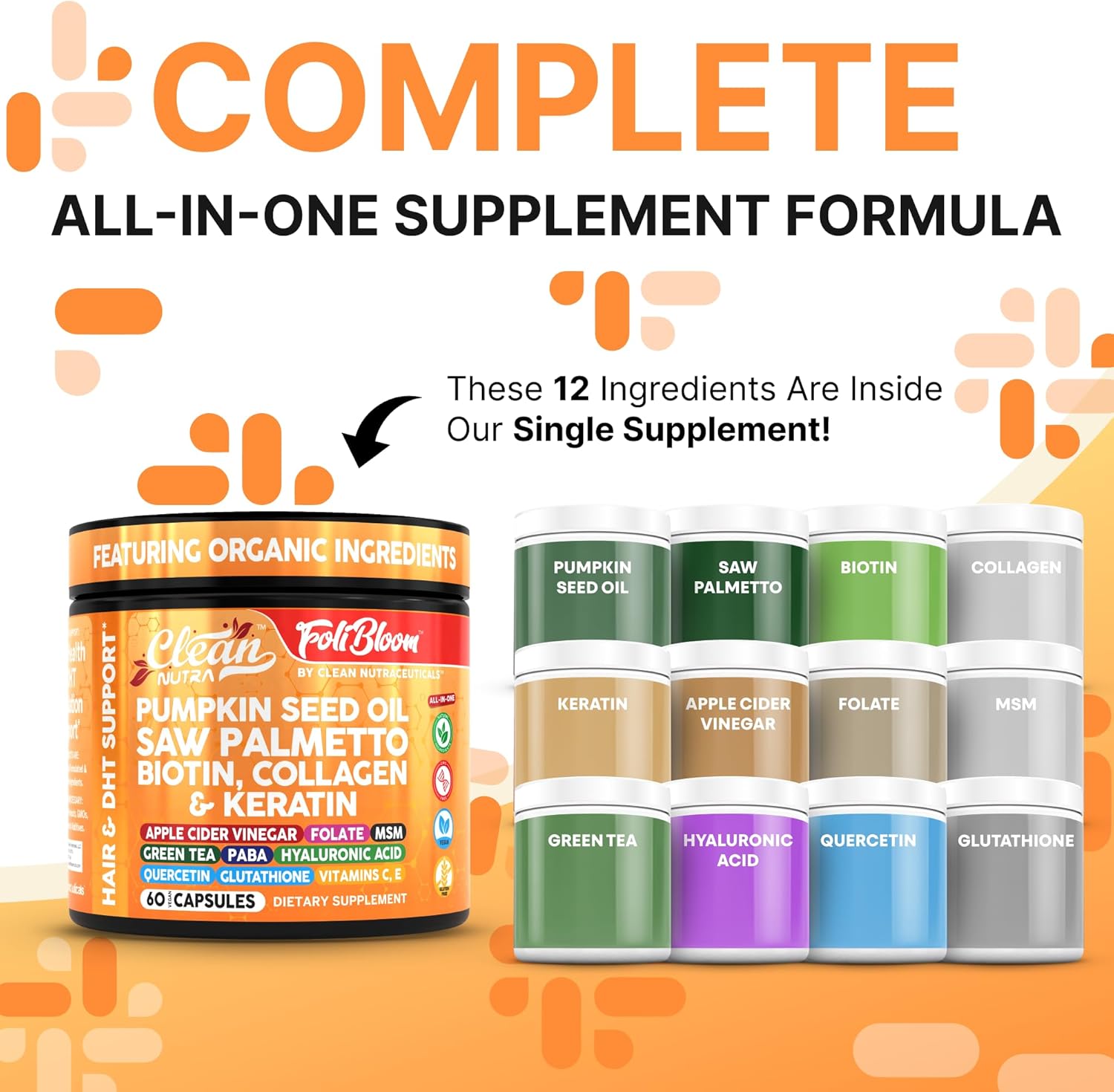 - Advanced pumpkin seed oil follicle-focused nutrition for men and women โ Clean Nutra fortifies every 60-capsule bottle with premium collagen, antioxidant-rich pumpkin seed, saw palmetto, biotin, quercetin and vitamins C & E to fuel vibrant growth from root to tip. Unlike ordinary hair pills, our hyaluronic acid supplements double as scalp hydrators, while selenium and chelated zinc help strengthen follicles so strands appear visibly thicker, fuller and more resilient with each wash.