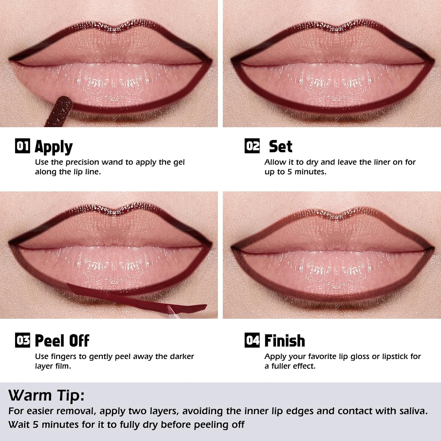 - EASY TO USE - Outline and fill in your lips with the lip stains. Wait for it to dry, then gently peel off for beautifully stained lips that last.(Warm Tip: For easier removal, apply two layers, avoiding the inner lip edges and contact with saliva. Wait 5 minutes for it to fully dry before peeling off.)