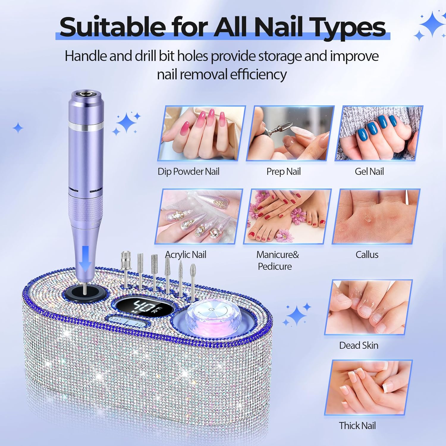 • 40000RPM Powerful Nail Drill Machine: Enjoy the fun of a bling bling AB Diamond that is covered with the drill body! JOSGLOI professional nail drill has a high-torque motor that delivers stable current power and speed, ensuring smooth operation even at high speeds (up to 40,000 RPM). Stable current and movement is a prerequisite for high speed, even the hardest nails can be easily handled. (Note: The JOSGLOI electric nail files are not rechargeable model)