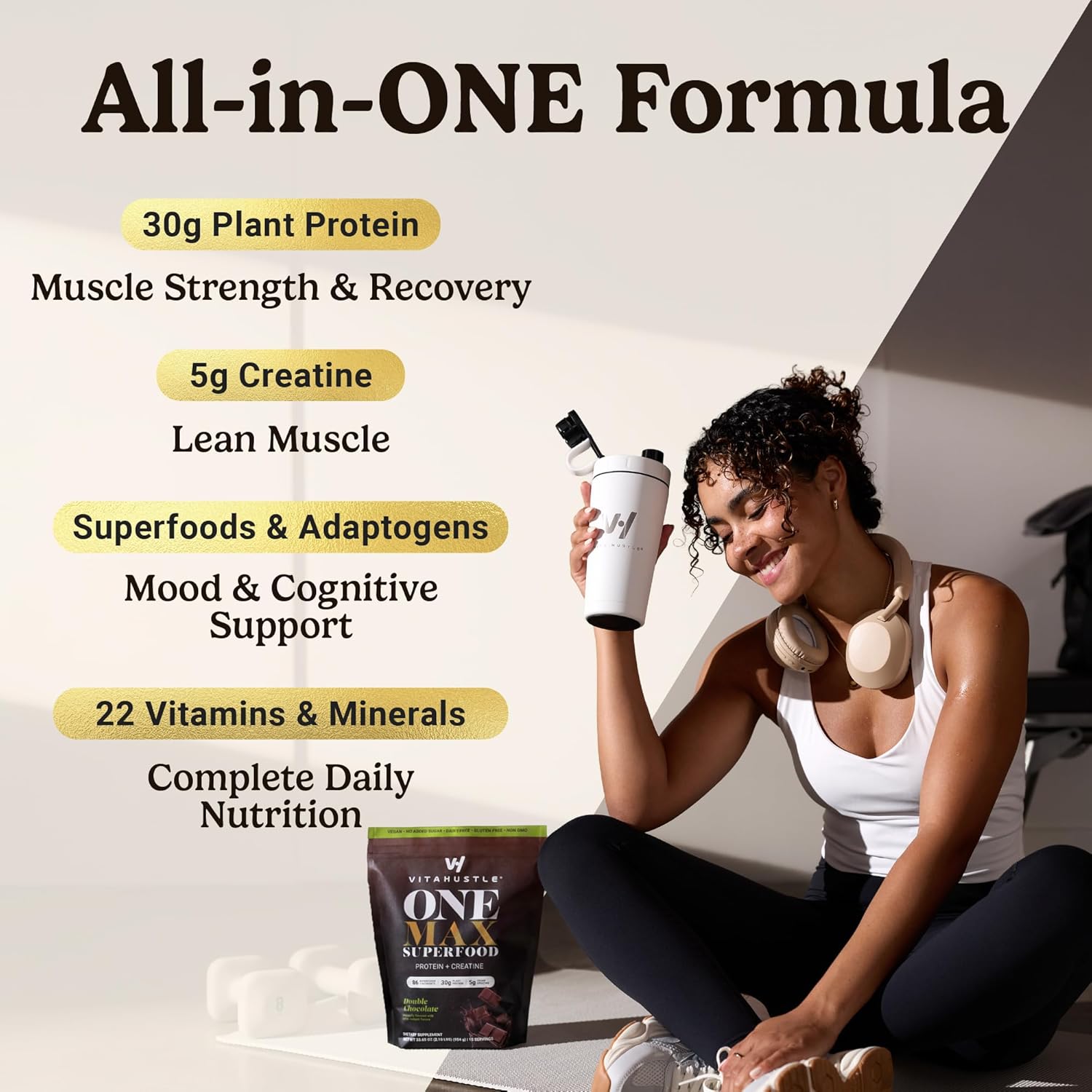 VitaHustle ONE Max Protein Powder, 30g Plant Protein + 5g Creatine, All-in-One Meal Replacement Shake with Greens, Adaptogens, Ashwagandha, Probiotics & Vitamins – Double Chocolate, 15 Servings