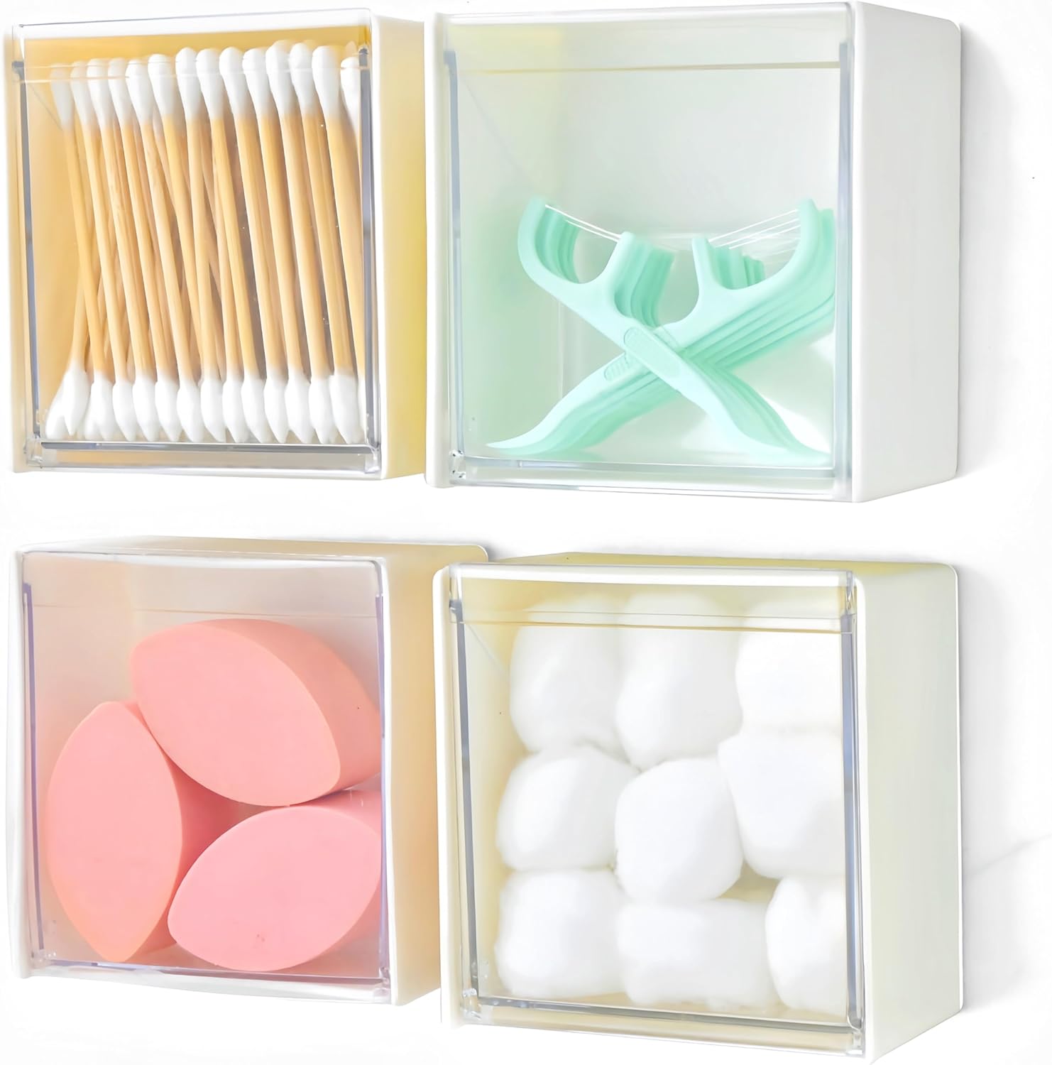 Qtip Holder Wall Mount for Cotton Swabs, Balls, Pads, Hair Ties,Floss Picks- Small Plastic Bathroom Wall Organizers and Storage Set,Bedside Shelf,Home Decor,Dorm Room Essentials (4)