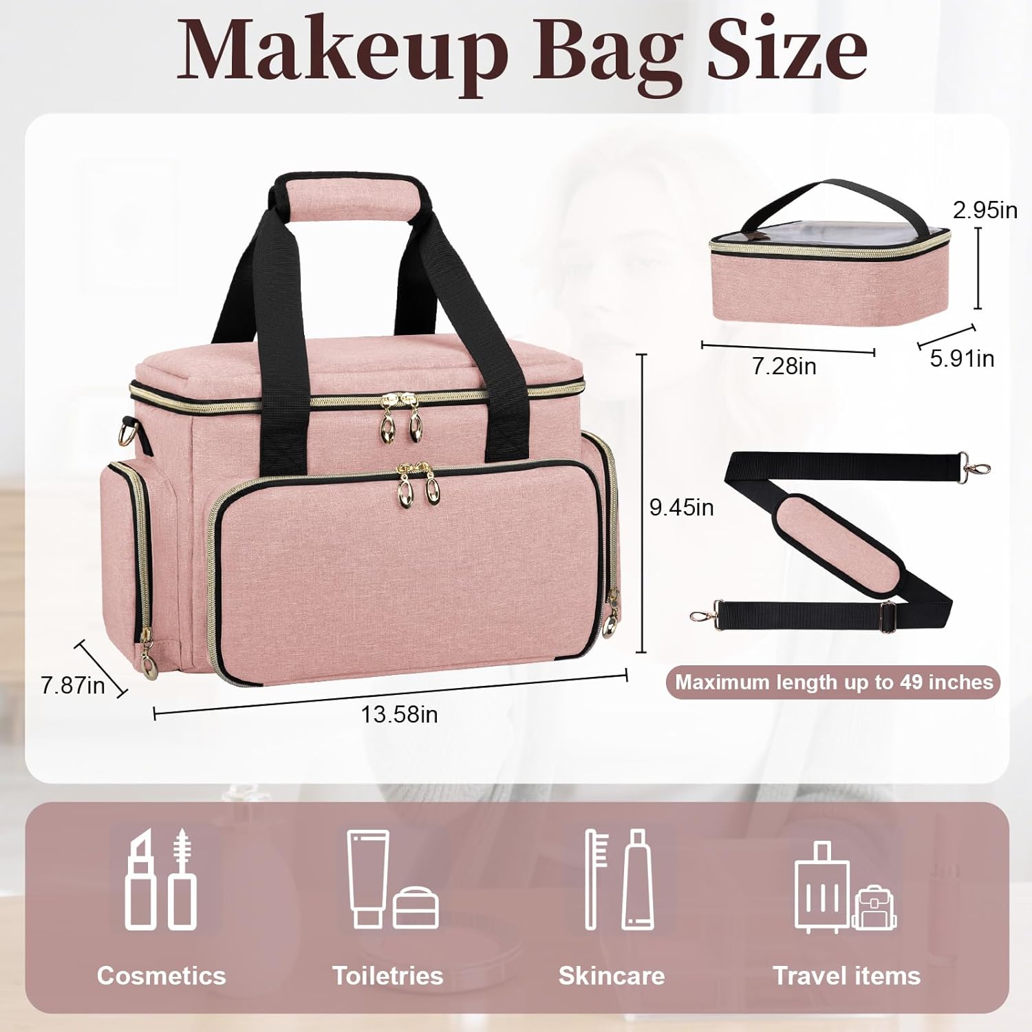 Large Makeup Bag, Portable Travel Makeup Bag Organizer for Women Girls with 2 Removable Pouches & Detachable Dividers, Cosmetic Travel Bag, Toiletry Bag for Makeup and Hair Supplies Pink