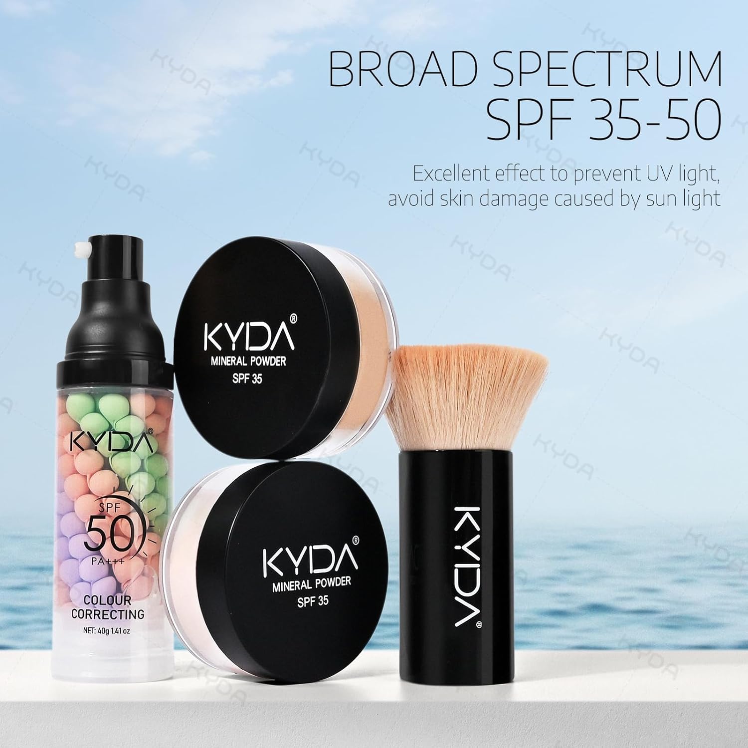 KYDA Mineral Makeup Kit, Includes SPF 50 Color Correcting Primer, SPF 35 Loose Powder Foundation + Translucent Loose Setting Powder, Foundation Brush, Makeup Starter Set, Travel Size - Fairly Medium