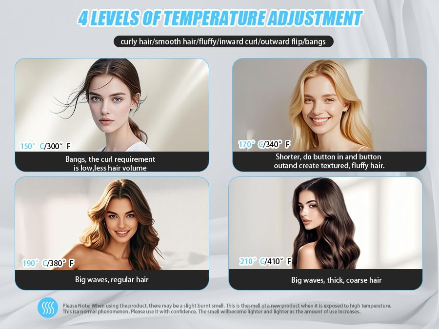 - [Suitable for All Hair Types and Lengths] This styling brush features a 1.5-inch keratin-coated barrel with four temperature settings (302-410Β°F / 150-210Β°C) for fine, medium, and coarse hair. From bangs to crown, effortlessly create sleek straight hair, voluminous curls, or tousled roots