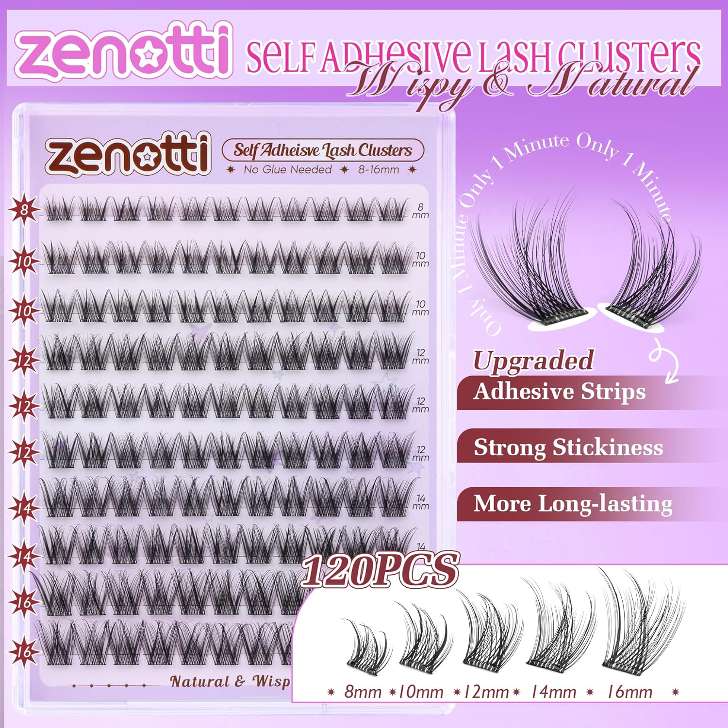 - 【Comfort That Lasts: Upgraded Version for All - Day Wear】Made from soft materials, zenotti self adhesive cluster eyelashes feel like a second skin. Our no glue lashes apply mild formula and upgraded self adhesive strips, that provide a long-lasting hold, so you can enjoy comfort from morning to night with our pre-glued lash clusters .