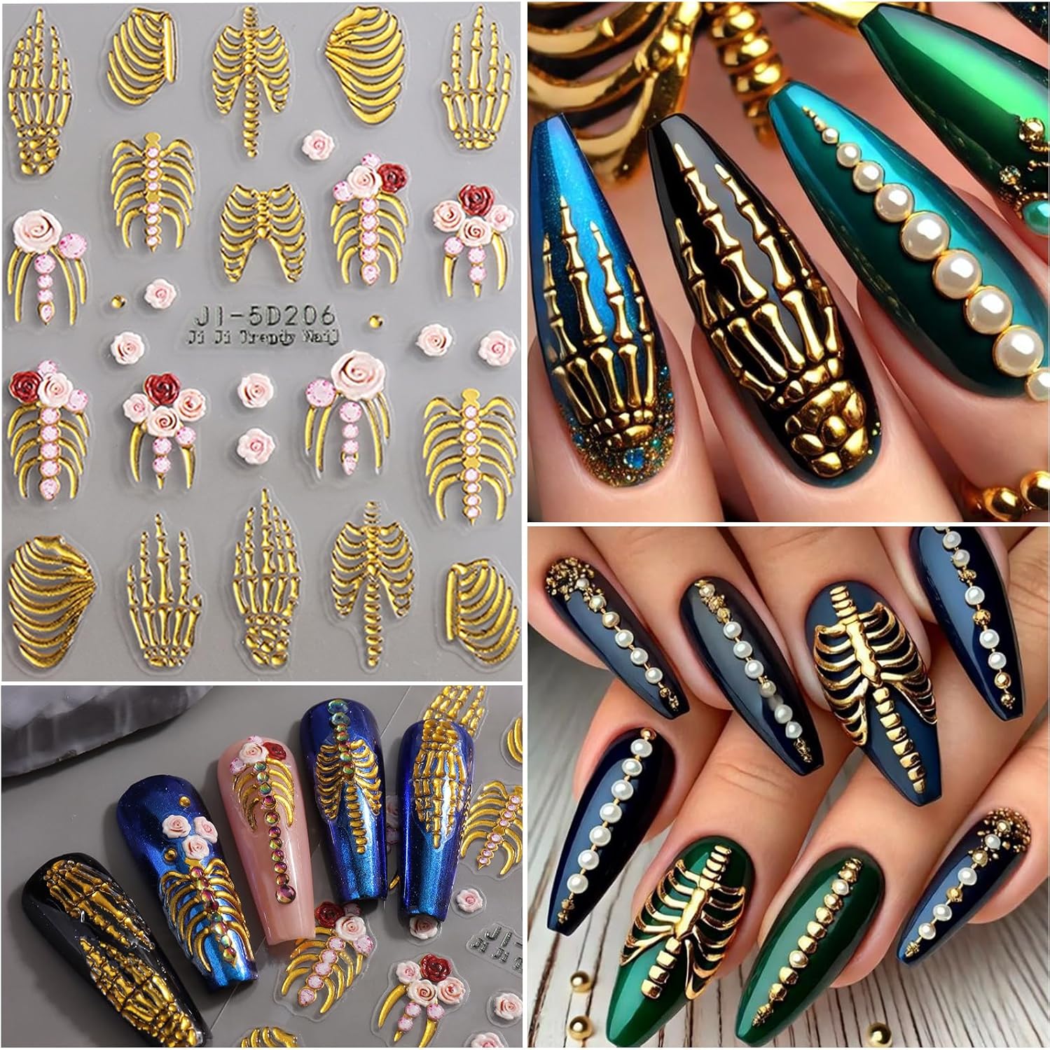 VOTACOS 5 Sheets Halloween Nail Art Stickers Decals 5D Nail Decals Gold White Bone Pattern Sticker Self-Adhesive Skull Nails Supplies Accessories 3for Women Halloween Nails DIY Decoration
