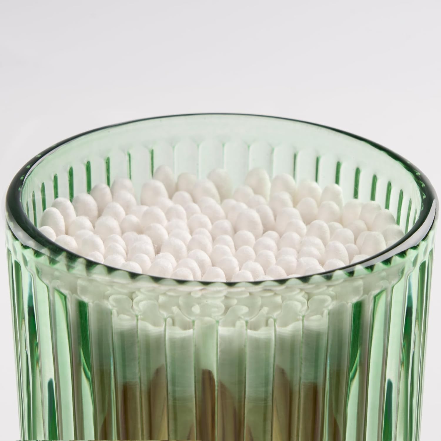 - Elegant Bathroom Organizer & Storage -Introducing our 9.8oz (3.9 x 3.5 inch) glass qtip holder with lid. Perfect for storing cotton swabs, cotton balls, cotton pads, bath salts, floss picks, hair tiesand more. This stylish and versatile bathroom accessory keeps your vanity, countertop, or dresserneat while adding a modern touch to your home dΓ©cor. ldeal for bathroom, dorm, bedroomkitchen, or office organization. Available in multiple colors to match any style